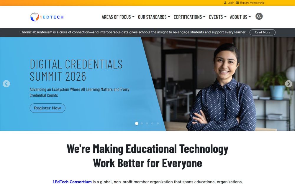 1EdTech(原 IMS Global Learning Consortium)是一个以推动教育技术互联互通为核心的全球非营利组织。其使命在于通过制定、维护和推广开放标准与认证项目,简化教育系统间的数据交换,提升教学工具的兼容性和可扩展性。网站介绍了组织的工作流(workstreams)、成员网络、研究报告、活动(如会议与峰会),以及能够直接帮助学校、机构与供应商的实务资源。