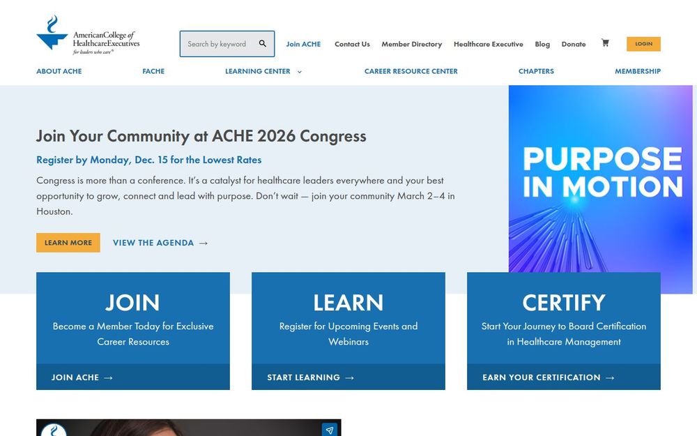 美国医疗管理学院(ACHE)是一个面向医疗机构管理者与领导者的专业组织,旨在提升医疗管理职业的能力与影响力。ACHE通过会员制度、教育项目、资格认证(如FACHE)以及年度大会等活动,为成员提供持续学习、网络拓展和职业发展机会。网站内容涵盖活动注册、在线课程、出版物、职位中心与企业合作伙伴信息,便于医疗管理人员在不同职业阶段获取所需支持与资源。