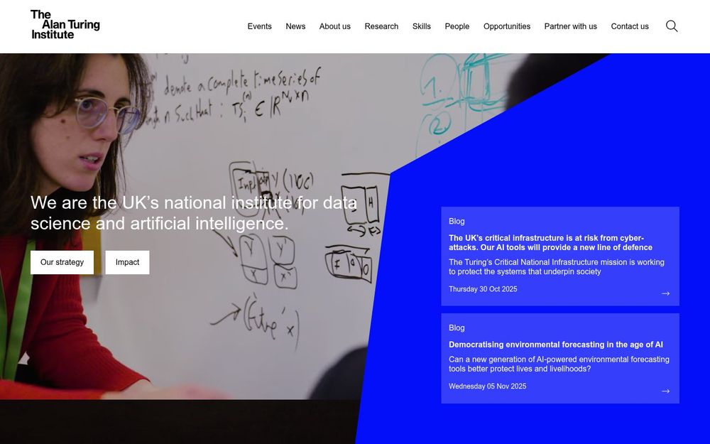 The Alan Turing Institute(简称 Turing)是英国的国家数据科学与人工智能研究机构,旨在通过跨学科研究、政策建议和产业合作,利用数据与 AI 技术解决社会、环境与经济领域的重大问题。网站集中展示机构的新闻、博客、研究项目、研究员风采和各类对外活动,便于学术界、产业界和公众了解其研究方向与影响力。