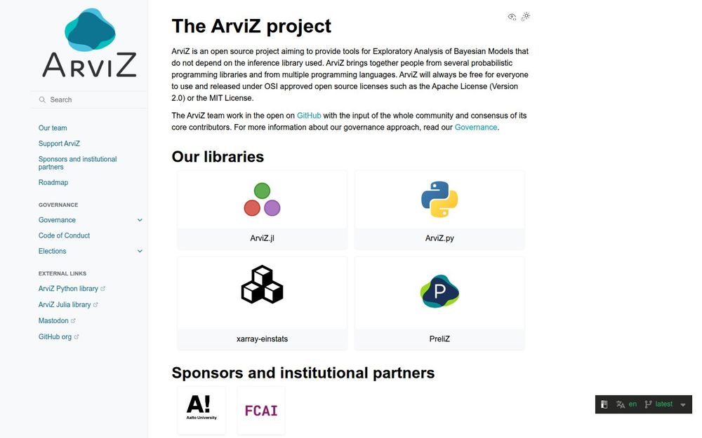 ArviZ 是一个专注于贝叶斯模型后处理与探索性分析的开源项目,目标是在不依赖具体推断库的前提下,为用户提供统一的诊断、可视化和模型比较工具。该项目由多个概率编程库和多种编程语言的贡献者共同维护,代码与讨论在 GitHub 上公开进行,采用 Apache 或 MIT 等开源许可证以确保自由使用与再分发。