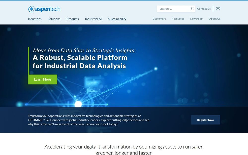 AspenTech 是一家以工业软件为核心的技术公司,专注于为大型工厂与工程项目提供资产优化与过程工程解决方案。其产品线覆盖从工艺建模、生产排程到资产性能管理与工业 AI 应用,旨在通过数据驱动的方法实现设备更长寿命、更高产能与更低能耗。网站不仅介绍产品与技术,还整合了行业案例、白皮书、视频与全球活动(如 OPTIMIZE™)以帮助客户快速落地数字化转型战略。