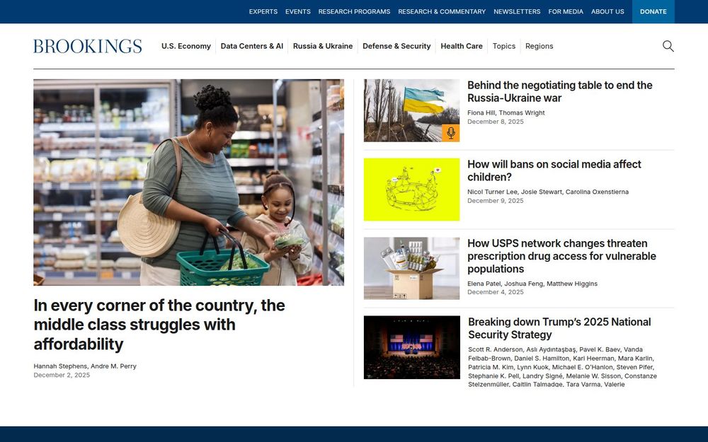 布鲁金斯(Brookings)是美国著名的独立公共政策研究机构,拥有超过百年的历史。其网站汇集研究文章、政策报告、事件资讯、播客与多媒体内容,覆盖国内经济、外交安全、科技与人工智能、气候能源、教育与社会公平等多个领域。作为一个以证据为基础的智库,布鲁金斯强调研究质量、独立分析与实际影响,面向公众、学界与政策制定者传播研究成果并推动政策讨论。