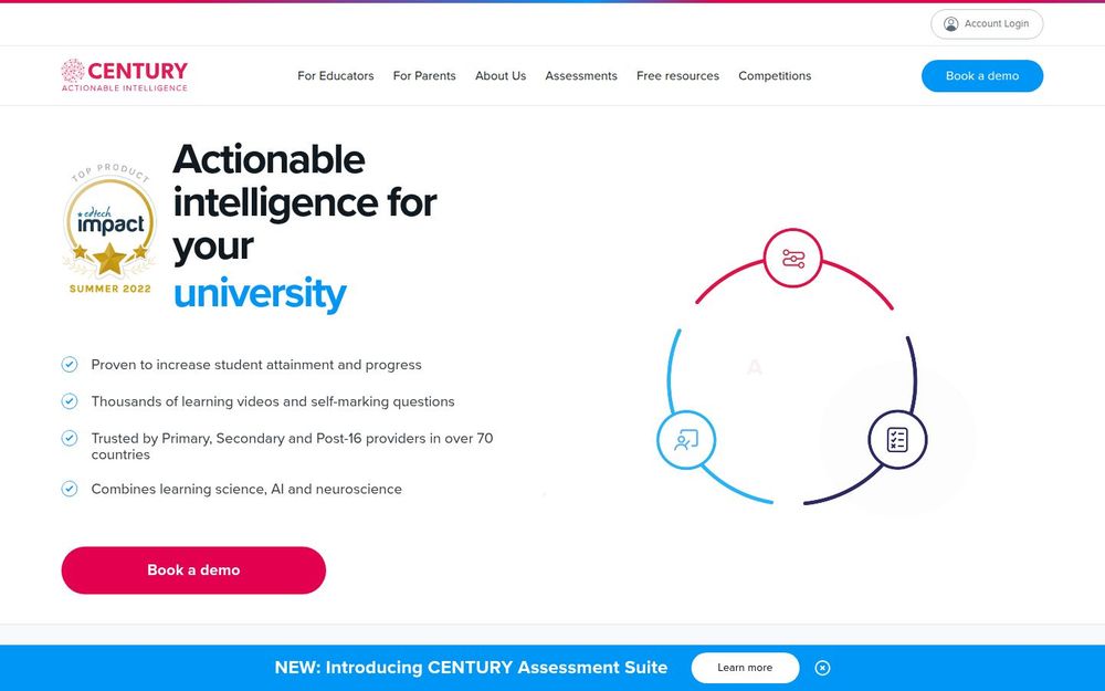 CENTURY 适合用于课堂内外的混合教学、远程学习以及为期中/期末考试做针对性复习。学校可以先通过试点年级或科目验证平台带来的学习增益与教师工作量下降,然后逐步推广全校部署。平台同时提供演示预约(Book a demo),便于教育决策者评估匹配度。