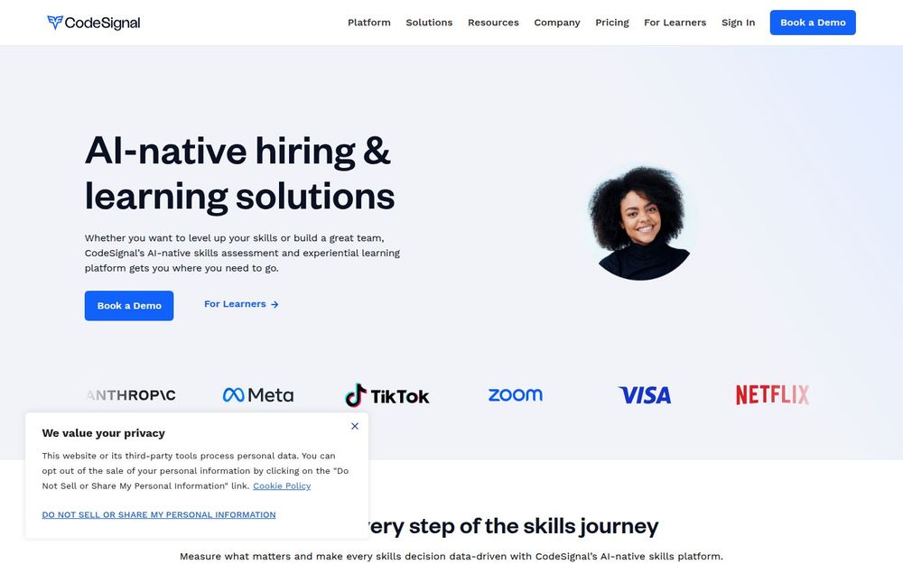 CodeSignal 是一家以 AI-native(以 AI 为核心) 为定位的技能评估与体验式学习平台,旨在帮助企业和学习者以数据为依据做出技能相关决策。平台提供从候选人筛选、结构化面试到在职技能培养和能力基准分析的一站式解决方案,适配不同岗位、资历与业务场景。