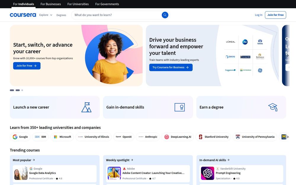 海量课程与多样化证书: Coursera 提供超过10,000门课程和来自350+机构的职业证书、专项课程和学位项目,覆盖 AI、数据科学、商业、计算机科学、医学等主流领域。