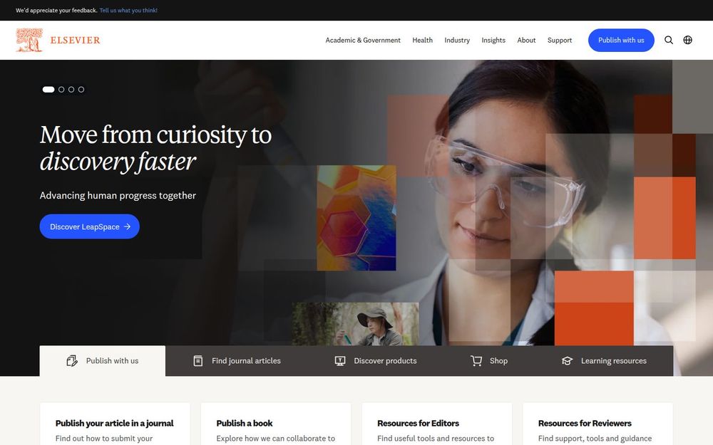 Elsevier 是一家专注于科学、技术与医疗领域的信息与决策支持公司,旨在通过可信赖的内容、数据与工具推动人类进步。网站展示了公司面向不同用户群体(学术与政府、医疗、产业)的产品与服务,并强调从研究发现、知识传播到临床应用的全流程支持。Elsevier 同时提供投稿与出版渠道、学习资源以及面向图书馆和资助机构的分析工具。