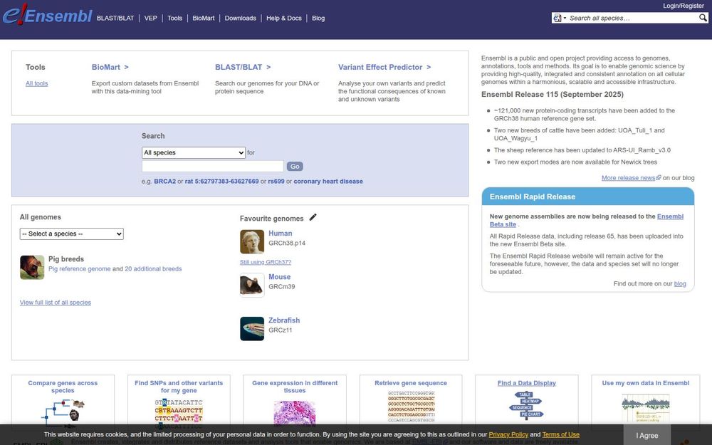 Ensembl 是一个面向全基因组的公共平台,由 EMBL-EBI 主导,旨在创建、整合并分发高质量的参考数据及分析工具,支持基因组学研究与注释工作。网站覆盖数以千计的物种,提供一致、可扩展的注释架构以及便捷的数据访问方式,包括网页浏览、批量下载、BioMart、REST API 和多种在线工具。Ensembl 每次发布都会整合新增基因组和注释改进,例如 Ensembl Release 115 对人类参考基因组增加了大量蛋白编码转录本,并更新了若干家畜和羊的参考序列。