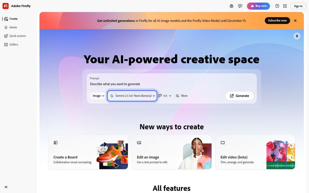- 多模型选择:用户可在 Adobe 自研模型与伙伴模型间切换,按需求选择风格与性能权衡(如 Gemini、Imagen、FLUX、Runway 等)。