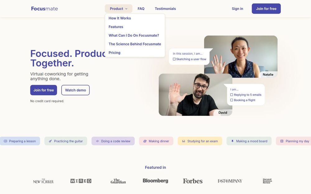 Focusmate 以“陪伴式专注”为核心,通过简单的配对与会话机制,让用户在日常与长期项目中都能借助他人的存在更容易开始并完成任务。