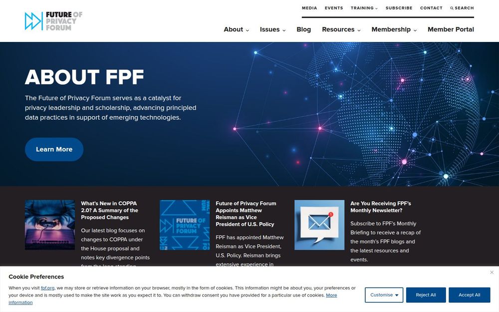 未来隐私论坛(Future of Privacy Forum,FPF)是一个专注于隐私领导力与学术研究的非营利性机构,旨在为新兴技术背景下的个人数据使用制定原则性、可操作的实践路径。FPF 汇聚产业、学术界、民间社会与政策制定者,就隐私保护、伦理规范与可行的最佳实践开展研究并推动公共讨论。网站提供大量资源,包括博客、问题简报、新闻稿与订阅通讯,便于不同受众获取前沿政策与研究成果。