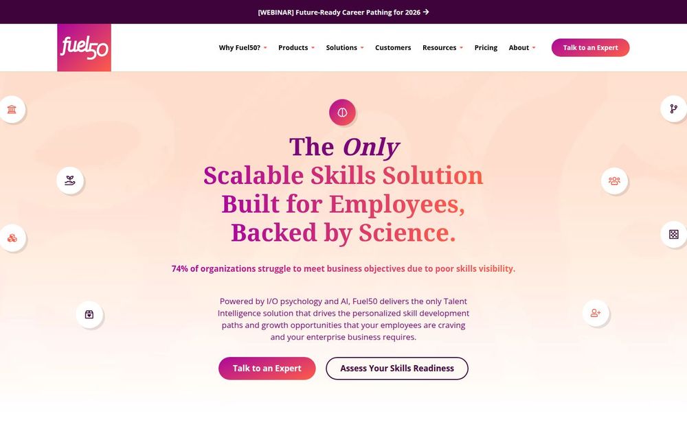 Fuel50 是面向企业的 Talent Intelligence(人才智能)平台,以 I/O 心理学与人工智能技术为基础,旨在帮助组织关闭技能差距并实现基于技能的人才战略。平台通过持续的技能评估、数据洞察与个性化发展路径,支持员工成长与内部流动,同时为人力资源和业务领导提供可操作的决策依据。Fuel50 强调以人为本的设计,让员工能看到明确的职业路径,并使组织能够以更低的成本和更高的速度满足业务所需的技能需求。
