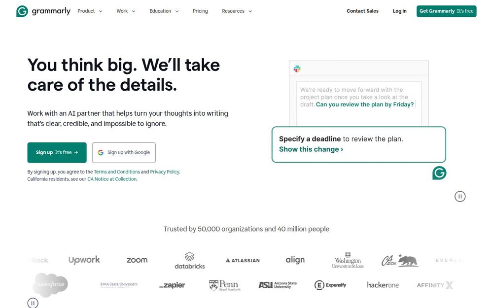 官网列举了“受信任的 50,000 家组织与 4,000 万用户”,并展示多个客户案例(如 Databricks、Zoom、Atlassian 等)与衡量指标——例如提升写作质量、节省编辑时间与显著的 ROI。官方还声明不出售用户内容、不用于广告,也不允许第三方服务提供商将用户内容用于训练其模型,从而强调负责任的 AI 使用与隐私保护。