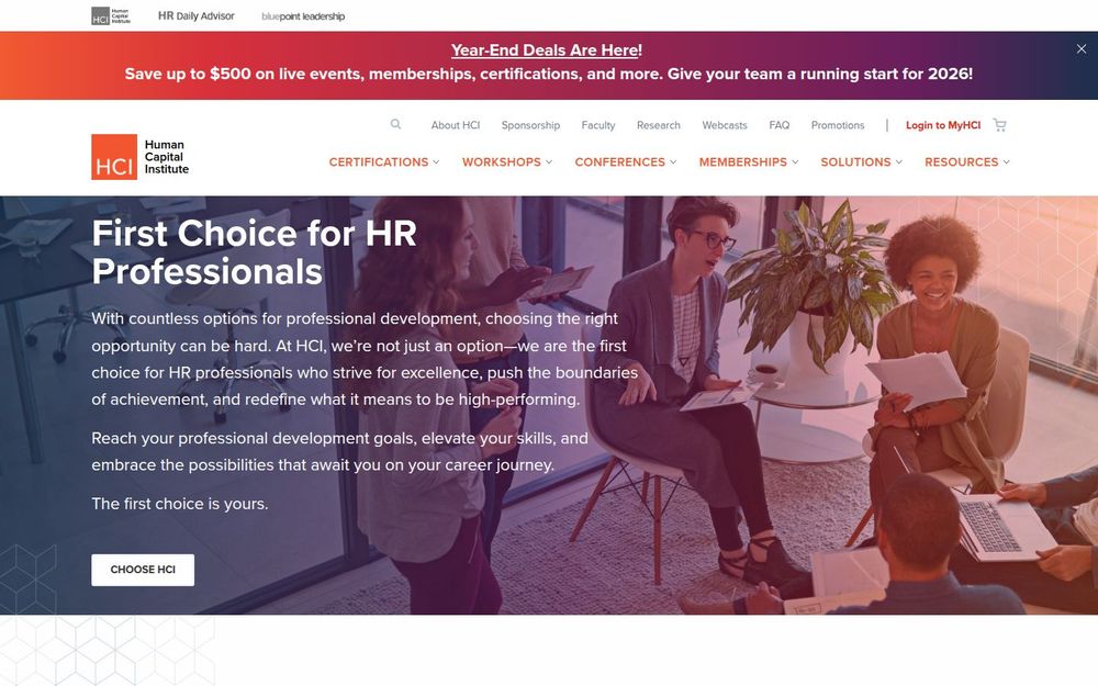 HCI(Human Capital Institute)是一家专注于人力资本与人力资源战略的专业组织,致力于为 HR 专业人士提供实用的培训、认证和行业活动。网站展示了其多样化的产品线与服务,包括会员计划、行业认证、虚拟与线下工作坊、沉浸式学习项目、网络研讨会以及面向企业的定制解决方案。HCI 强调以研究为基础的实践,旨在帮助组织将人力资源与业务战略深度结合,从而提升组织绩效与人才竞争力。
