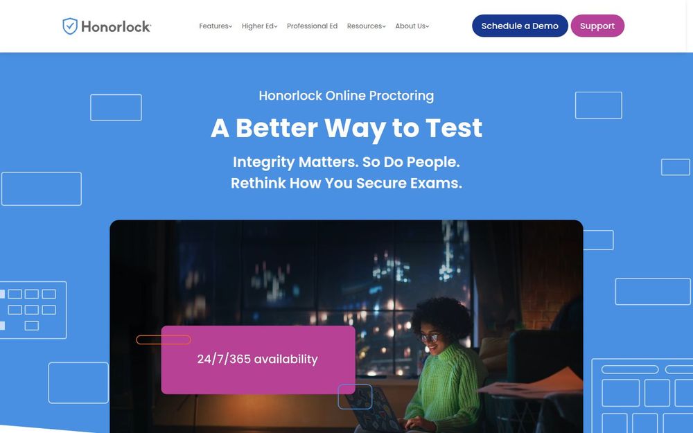 Honorlock 是一款面向高校、培训机构与认证考试组织的在线监考平台,旨在通过技术与人工结合的方式保护考试诚信并简化监考流程。平台强调“人性化的诚信保障”,不依赖复杂客户端安装,支持与主流 LMS 无缝集成,并提供全天候支持服务,帮助机构在远程或线上环境中可靠地开展评估工作。