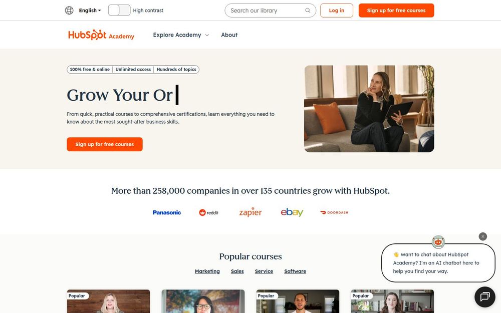 - 多样化的课程主题: 涵盖 社交媒体、内容营销、SEO、电子邮件营销、入站销售、HubSpot 软件操作 等热门领域,既有短课也有完整认证路径。
