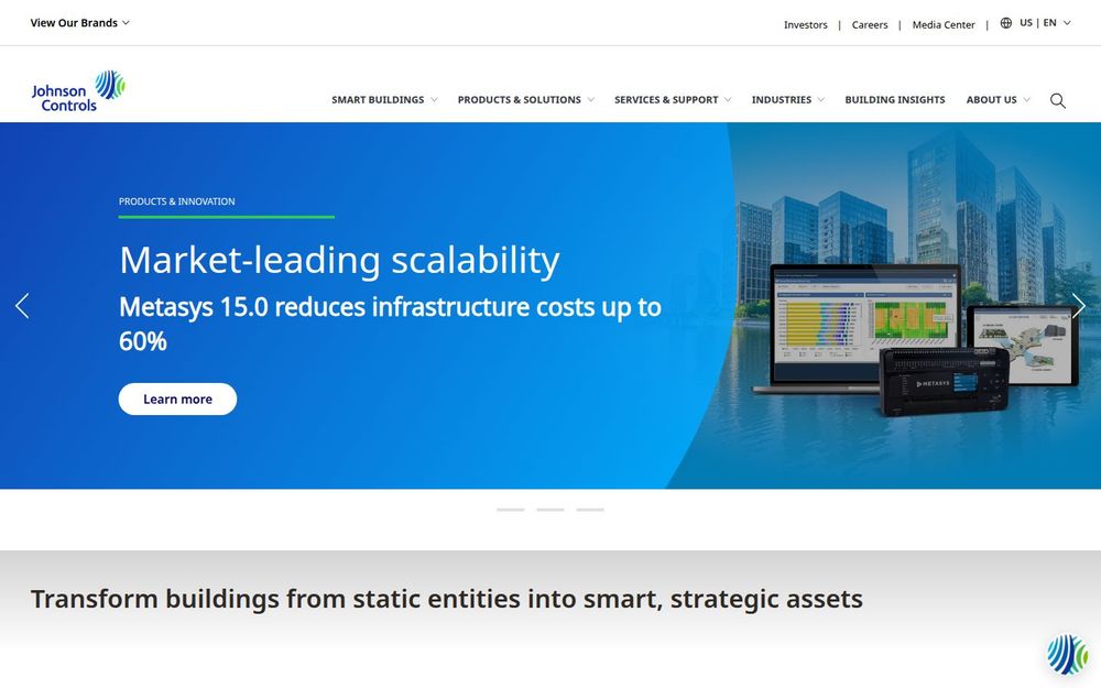 江森自控(Johnson Controls)致力于将建筑转变为具有策略价值的智能资产,通过软硬件一体化、数据驱动的管理平台与现场运维服务,帮助客户提升能效、保障舒适性并降低营运成本。网站内容覆盖产品发布、解决方案介绍、行业洞察与公司新闻,突出其在建筑自动化与智能建筑领域的市场领导地位。