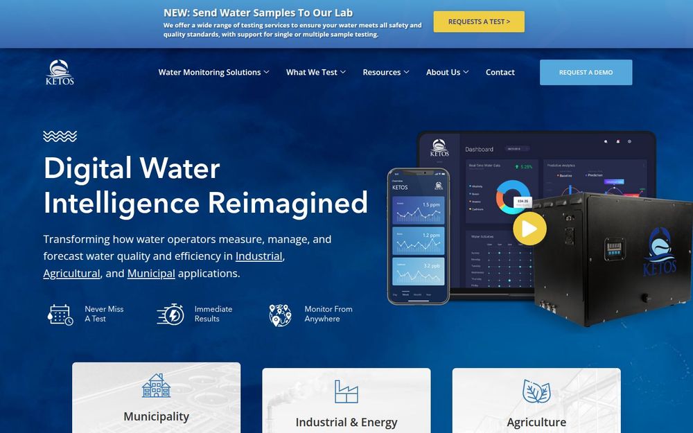 KETOS 是一家专注于将传统水质检测数字化的技术公司,提供从现场采样到云端分析的端到端水质监测解决方案。其核心硬件包括 KETOS SHIELD(实时、接近实验室精度的水质检测装置)和 KETOS WAVE(流量、压力与水效率监测器)。平台整合了物联网通信、云端数据仓库、自动化报告、阈值告警和预测分析,适用于市政、工业与农业等场景,帮助客户降低人工采样成本、提升合规性并预防质量事件。KETOS 在美国生产设备并拥有多国专利,产品宣称与认证实验室结果接近(约 ±10%),且符合 EPA 兼容性要求。