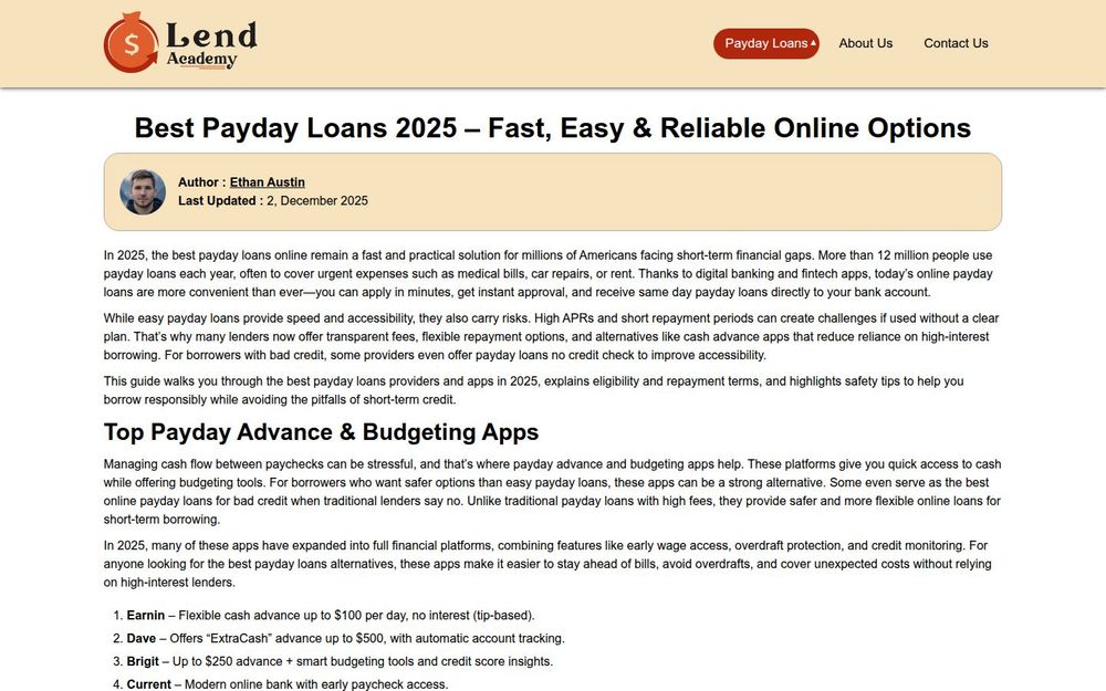 本指南由 LendAcademy 撰写,聚焦2025年可用的发薪日贷款(payday loans)及其更安全的替代方案。文章不仅评估传统线上发薪日贷款的速度与可及性,还深入介绍了以现金预支、提前发薪和预算工具为核心的金融应用如何在紧急场景中取代高成本短期借款。文中兼顾优点与风险,强调透明费用、还款计划与合规性的重要性,旨在帮助借款人理性决策并规避债务陷阱。