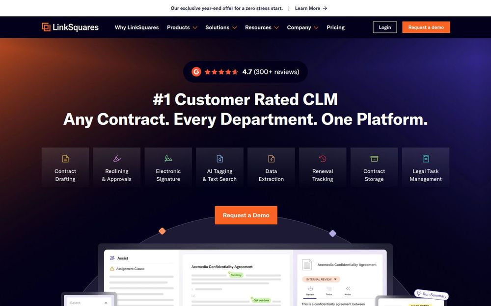 LinkSquares 是一款面向企业的合同生命周期管理(CLM)平台,通过自研的 LinkAI 与 Agentic AI 技术,将合同的起草、审核、谈判、签署、存储与分析整合在同一平台中。该平台旨在让法务、采购、销售与运营等不同部门共享单一合同视图,从而实现更高的可见性、更快的审查速度以及基于 AI 的洞察与风险评估。