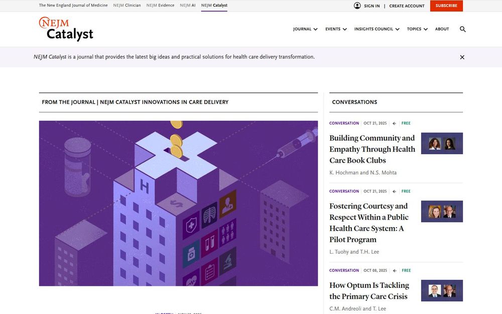 NEJM Catalyst 是 NEJM Group 旗下的数字期刊,致力于传播对医疗服务交付具有实际影响的创新思路与可操作方案。作为一份同行评审的刊物,NEJM Catalyst 每月发布多期内容,内容形式包括文章、案例研究、洞察报告、对话(Conversations)与线上活动等,强调将理论与实践连接,帮助医疗机构在成本、质量与可及性之间取得平衡。