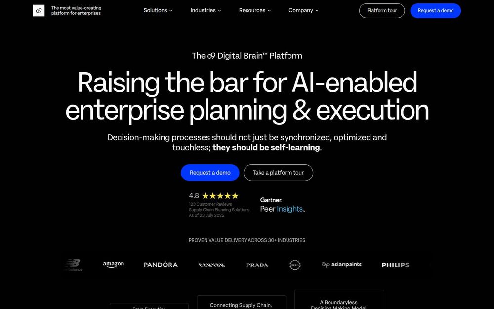 o9 面向零售、消费品、汽车供应商、食品饮料、制药与资本品等多行业提供行业化解决方案,包含商品计划、品类分配、价格与促销优化等。公司拥有广泛的合作伙伴生态(如微软、Accenture、IBM、AWS、Google Cloud 等),并在 Gartner 等第三方评估中获得行业认可与客户口碑。