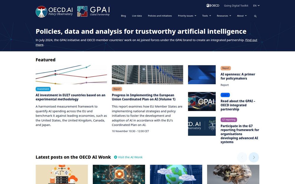 OECD.AI 是经合组织(OECD)建立的人工智能政策观察平台,旨在通过政策研究、数据测量与实证分析支持各国政府、监管机构、研究人员和民间组织制定与实施可信赖的 AI 策略。自 2024 年与 GPAI 整合以来,平台进一步扩展了跨国合作与知识共享的能力,覆盖从投资衡量到透明度报告、从计算资源地图到公共 AI 政策等广泛议题。