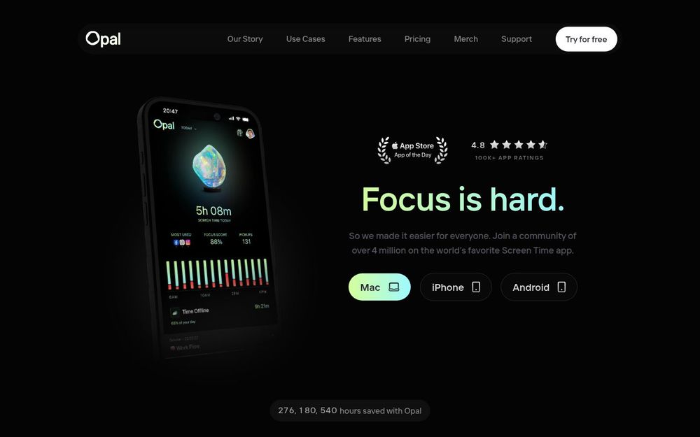 Opal 是一款面向个人与家庭的屏幕时间与专注管理应用,覆盖 iPhone、Android 和 macOS。与系统自带的屏幕时间不同,Opal 强调用可视化数据、行为约束与社交激励相结合的方式,帮助用户有意识地减少无效使用、重建注意力节律与提升日常产出。页面展示了其社区规模、用户评分与影响数据(如每日平均节省 1 小时 23 分钟),并提供多平台下载与试用入口。