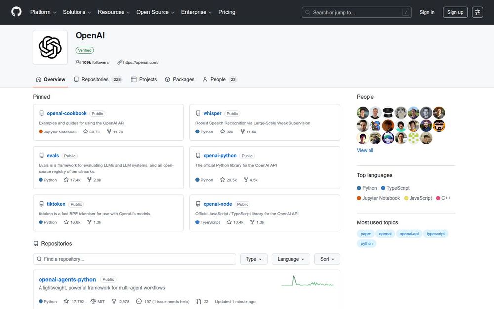 OpenAI 的 GitHub 组织是 OpenAI 团队对外开源与社区协作的主要平台之一,旨在通过共享代码、示例和工具来推动 AI 应用的开发与研究。该组织包含官方 SDK、示例库、模型实现、评估框架以及辅助工具,覆盖 Python、TypeScript、Go 等多种语言生态。无论是新手学习使用 OpenAI API,还是研究者开展模型评估,或是工程师在生产环境中集成模型,均能在这里找到有价值的资源。
