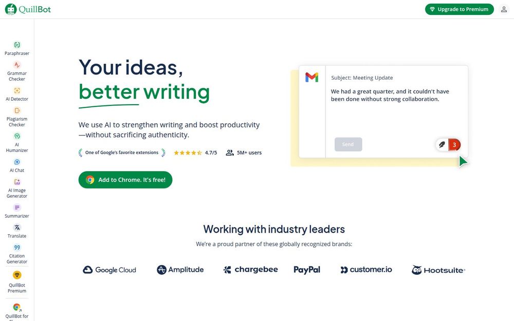 QuillBot 是一款集成多种 AI 写作工具的平台,旨在帮助用户更快速、更自信地完成写作任务。它以“AI 与你共写,而非替你写”为核心理念,提供从句子改写、语法校对到抄袭检测与引用生成的一站式写作解决方案。无论是学生写论文、专业人士写邮件,还是内容创作者产出稿件,QuillBot 都试图通过自动化与智能建议提升文本质量与表达流畅度。
