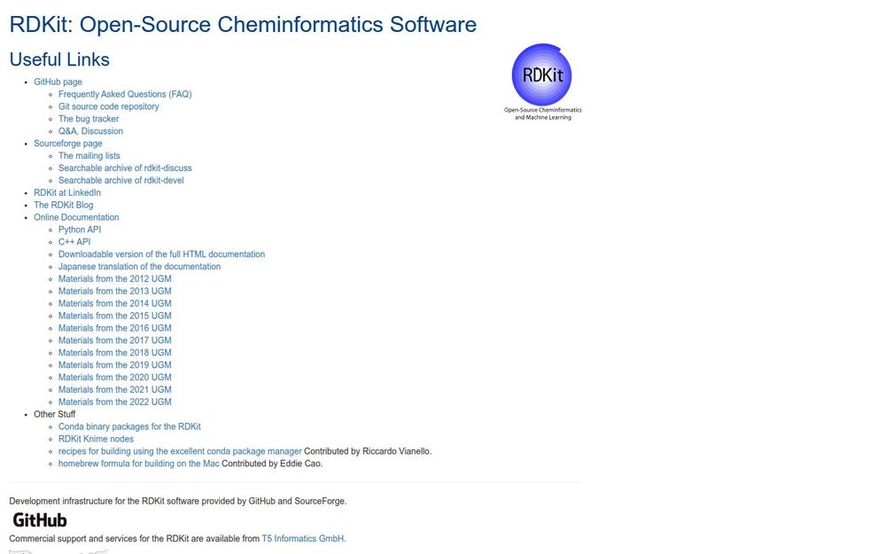 RDKit 拥有完善的在线文档、API 参考(Python API 与 C++ API)、示例代码和可下载的完整文档包。社区活动集中在 GitHub(源码、问题追踪、讨论)和 SourceForge(邮件列表、历史档案),并有博客和会议材料(UGM)供学习。安装方式多样:通过 Conda 包、Homebrew 配方或源码编译均可获得,此外还提供 KNIME 节点等生态集成。