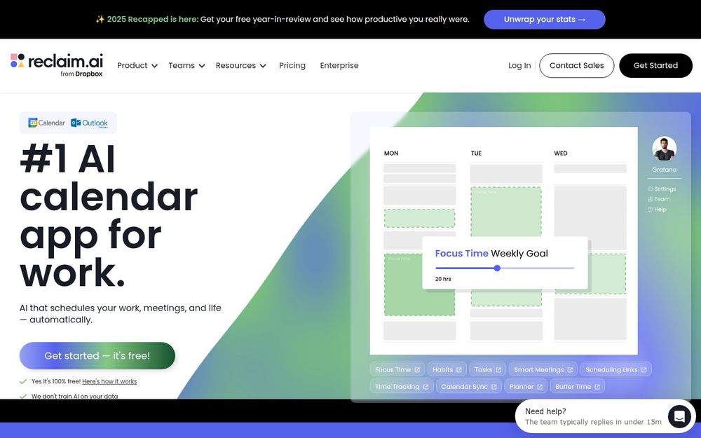 Reclaim 是一款以 AI 自动排程 为核心的日历助理,旨在帮助个人与团队“找回时间”,把日历从被动的会议列表变成主动的生产力工具。用户连接 Google 或 Outlook 日历后,Reclaim 会根据优先级、工作习惯与可用性自动为任务、习惯和专注时段(Focus Time)保留时间,并在必要时灵活重排来应对紧急事项。产品覆盖个人使用、团队协作与企业治理,既有免费永远可用的 Lite 方案,也提供 Starter、Business 与 Enterprise 等付费计划以及免费试用期。