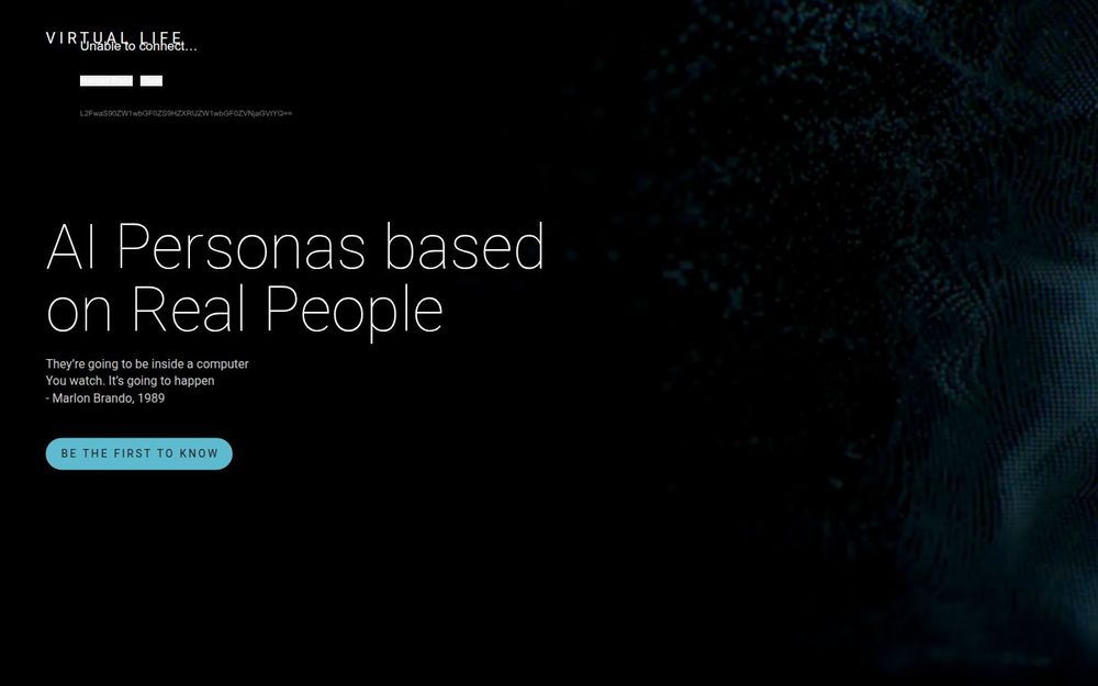 Rival Theory 的网页围绕“Virtual Life”展开,展示了一个关于基于真实人物的 AI 角色的概念性项目。页面包含一句来自马龙·白兰度(Marlon Brando, 1989)的引言:“They’re going to be inside a computer / You watch. It’s going to happen”,以及一个标注为私有的 Vimeo 视频,提示该项目以多媒体呈现为主且部分内容处于受限访问状态。页面同时鼓励用户“Be the first to know”,表明存在订阅或后续发布的期待机制。