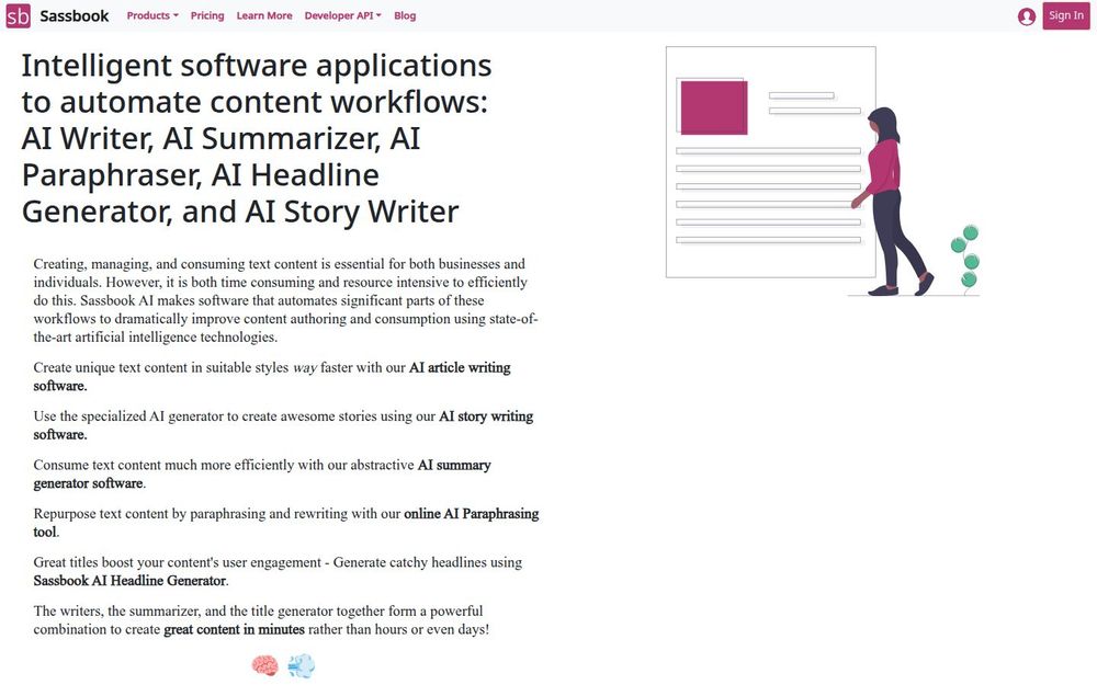 Sassbook AI 是一套面向文本工作流自动化的智能工具套件,旨在用人工智能显著提升内容创作与消费的效率。平台包括 AI 文章写作器、AI 故事写作器、AI 摘要生成器、AI 改写/仿写工具 和 AI 标题生成器 等模块,覆盖从创作、改写到摘要与标题规划的多项常见场景。无论是个人写作者、营销团队还是企业文档人员,都可以利用 Sassbook 快速生成合适风格的文本并进行批量处理。Sassbook 同时提供免费体验和付费套餐,并开放 开发者 API,便于集成到现有应用或自动化流程中。