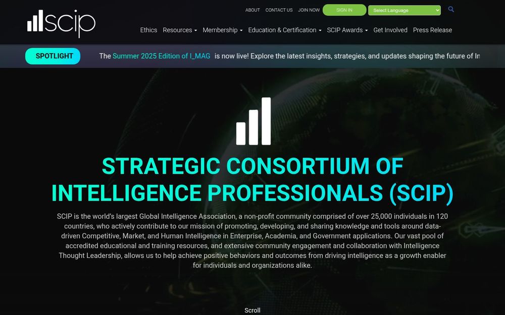SCIP(Strategic Consortium of Intelligence Professionals)是一个全球性的情报专业社区,致力于通过数据驱动的情报推动组织决策和社会进步。作为非营利组织,SCIP 汇聚企业、学术和政府领域的专业人士,提供实践方法、教学认证、工具库以及跨区域协作平台,旨在将情报作为增长与责任治理的双重引擎。
