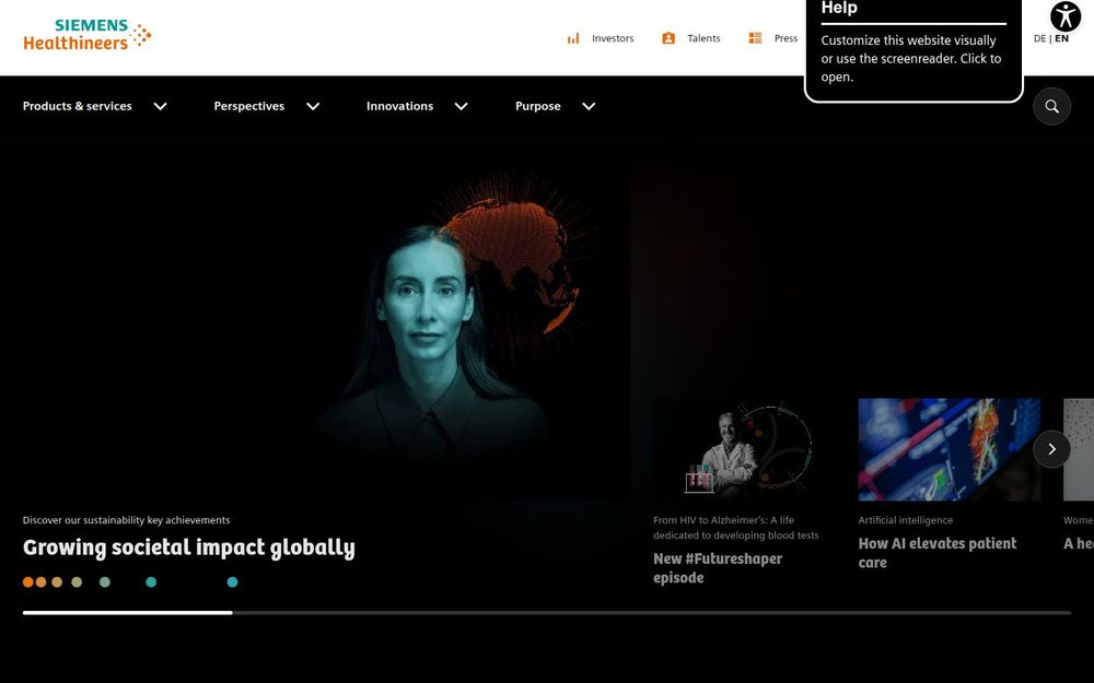 Siemens Healthineers 是一家以医疗影像、体外诊断和医疗服务为核心的全球性医疗技术公司。官网不仅展示公司产品与服务,还强调创新驱动、可持续发展与全球协作。站点内容包含新闻与专题(如 AI 在医疗的应用)、无障碍工具 Eye‑Able、可持续发展报告、投资者关系信息及面向临床专家的快速链接,旨在为医疗服务提供者、研究机构与决策者提供全面资讯与解决方案。