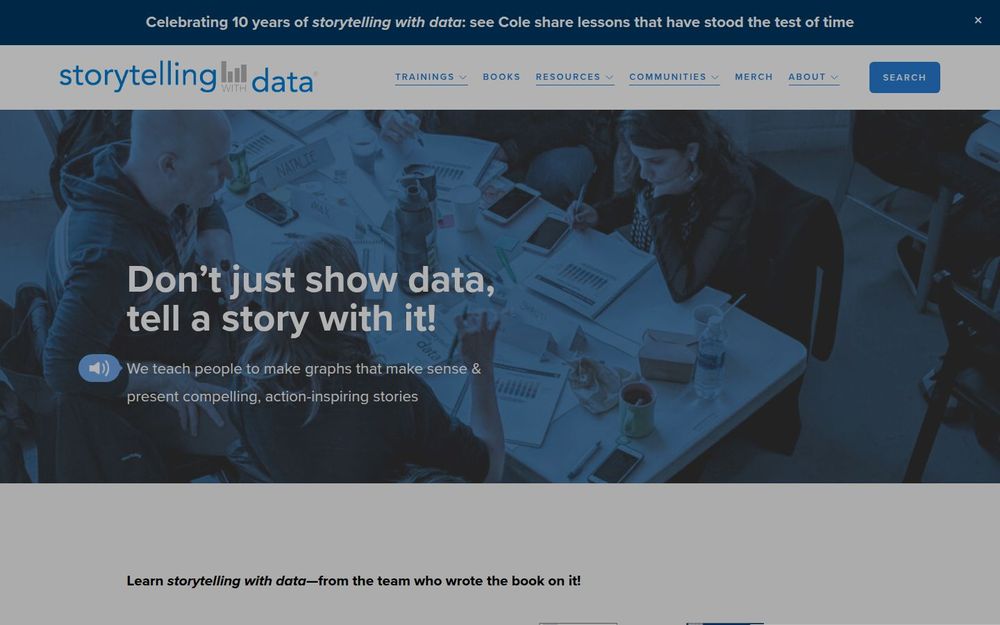 Storytelling with Data(用数据讲故事)由同名畅销书作者团队创办,致力于将数据可视化与叙事技巧结合,帮助个人与团队把数据“展示”转为“讲故事”。网站既展示了教学方法论,也提供丰富的实操资源,如图表与幻灯片改造、学习视频与书籍推荐。培训形式灵活,覆盖虚拟与现场、短时演讲到整日工作坊,并提供面向团队的定制化方案。