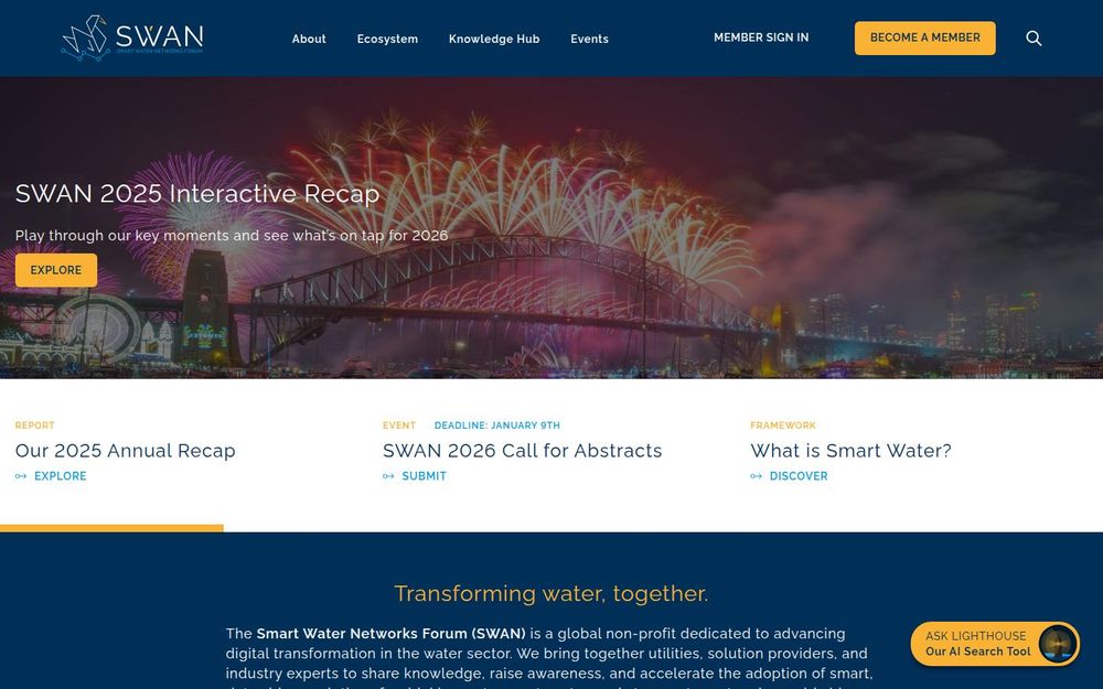 SWAN(Smart Water Networks Forum)是一个全球性的非营利组织,旨在通过数字化和数据驱动的解决方案提升供水、污水和雨水网络的效能与韧性。该网站为行业专家、公共事业单位和技术供应商提供信息交流的平台,展示研究报告、案例研究、活动与社区成果,并通过会员体系促进跨区域协作与知识共享。