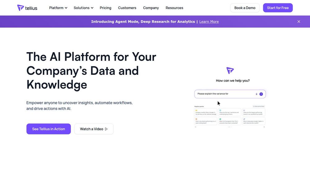 Tellius 是一家致力于把 AI 与分析嵌入企业决策流程的平台,目标是让任何人都能以对话式方式访问企业数据、快速发现“为什么”、并通过可执行的 agent 流程把洞察变成行动。平台将数据与知识层进行统一管理,提供无代码/低代码的数据准备、实时推算(pushdown)和统一的元数据层,支持从自助式报表到复杂预测模型的全流程分析。Tellius 强调“Answer + Act”(回答并执行),不仅提供洞察,还能通过 Agentic Apps 自动化复杂分析并触发后续动作。