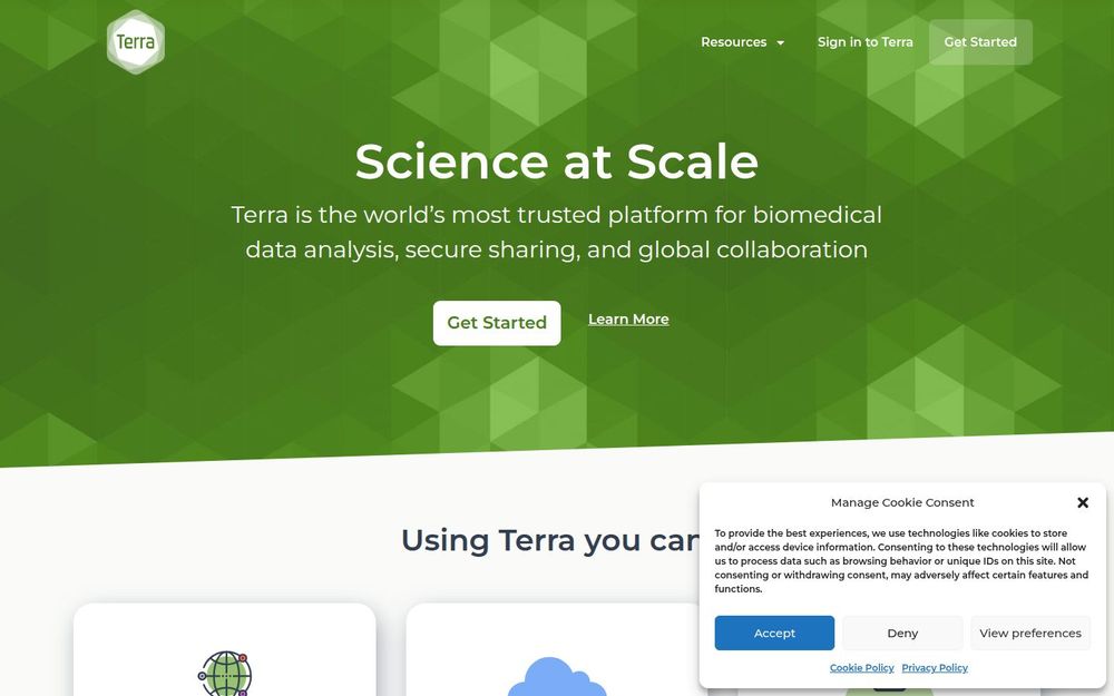 Terra 是一个面向生物医药研究与数据科学的云端平台,定位为“Science at Scale”。平台支持用户安全地访问 PB 级数据、运行可重复的分析流程,并在保持数据主权的同时实现跨机构协作。Terra 同时提供面向个人研究者与机构的使用路径,兼顾灵活性与合规需求,并通过开源代码与社区生态促进方法共享与透明性。