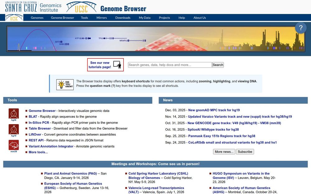 UCSC 基因组浏览器是由加州大学圣克鲁斯分校(UCSC)维护的综合性基因组数据平台,旨在对参考基因组和注释数据进行直观呈现与深度分析。该平台整合了多种物种的基因组装、基因注释、变异数据库、功能预测和表达数据,并通过图形化的轨道视图使用户能够在基因组坐标上交互式查看不同数据层。