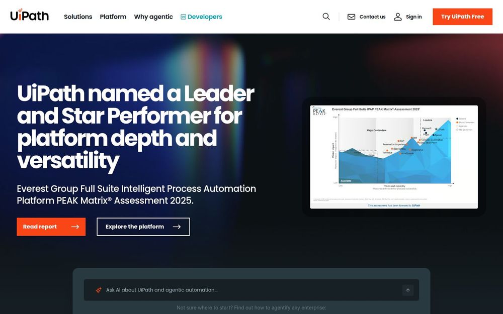UiPath 是一家专注于企业级流程自动化与 agentic 自动化 的软件平台供应商。其核心目标是将 AI 能力、智能代理(agents)、机器人和人类操作有机结合,实现从任务自动化到端到端流程重塑的转变。网站展示了平台的产品组合、行业解决方案、客户成功案例以及丰富的学习与社区资源,帮助企业在合规与可控的前提下加速自动化落地。