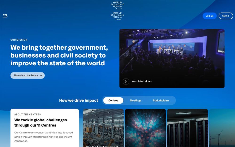 世界经济论坛(World Economic Forum)是一个面向全球的多利益相关方平台,致力于通过政府、企业与民间社会的协同合作改善世界状况。网站明确展示论坛的使命、结构及其推动变革的核心项目,包括年度会议、专题中心、研究与出版物、数字化产品与社会创新平台等多维活动。